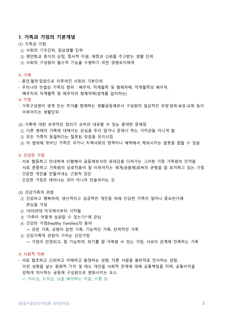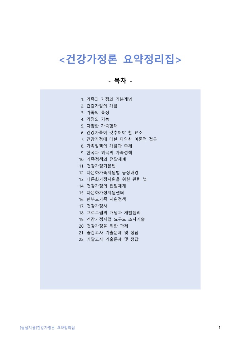 파일 문서(압축파일).zip(목차)1. 건강한 가족의 의미와 개념1.1 건강한 가족의 의미1.2 건강한 가족의 개념2. 건강한 가족의 특성2.1 가족 구성원의 균형과 화합2.2 가족 구성원의 자아실현2.3 가족의 사회적 기능 수행2.4 가족의 지속가능성3. 건강한 가족의 구성 요소3.1 가족 관계3.2 가족 기능3.3 가족 문화1. 건강한 가족의 의미와 개념1.1 건강한 가족의 의미건강한 가족은 현대 사회에서 매우 중요한 개념입니다. 가족은 개인의 삶에 가장 큰 영향을 미치는 기본적인 사회 단위이며, 건강한 가족은 개인과 사회 전체의 건강에 필수적인 요소라고 할 수 있습니다. 건강한 가족은 개인의 성장과 발달, 가족의 안정, 사회 통합에 중요한 역할을 합니다. 건강한 가족은 가족 구성원의 기본적인 욕구가 충족되고, 가족 구성원 간의 상호작용이 원활하며, 사회적 기능이 잘 수행되는 가족을 의미합니다. 이러한 건강한 가족은 개인, 가족, 심지어 전체 사회의 건강과 행복을 증진하는 데 기여할 수 있습니다. 건강한 가족이라는 개념에는 가족 구성원의 신체적, 정신적, 사회적 건강 수준, 가족 구성원 간의 긍정적이고 상호 존중하는 관계, 가족의 문제 해결 능력, 사회적 기능 수행과 같은 다양한 측면이 포함됩니다. 즉, 건강한 가족은 개인과 가족의 전반적인 건강이 좋은 상태로 볼 수 있습니다. 1.2 건강한 가족이라는 개념(문서 정보) 문서 볼륨: 5 페이지 문서 유형: PDF 문서 파일 크기: 55 Kb 태그 (#): #건강한 가족 이론 #가족 구성원 #자아 실현 데이터 번호(pk): 24136828