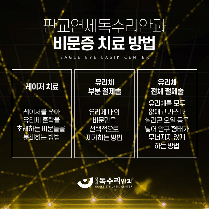 생리적 비문증의 경우 노화 과정 중 하나이므로 악화되거나 동반되는 여타 증상이 없는 경우 대부분 일정기간이 지나면 적응하게 됩니다. 본인이 비문증으로 불편함을 느끼지 않게 되었다면 향후 큰 문제가 되지 않을 가능성이 있습니다. 그러나 생리적인 요인이 맞는 것인지 확실히 하고 향후 안구건강 관리 대책의 수립을 위해서 진료를 받아보는 것이 도움이 될 수 있습니다.비문증 증상이 호전되지 않거나 보이는 물체 개수에 변화가 있거나 어둠시야, 광시증, 시력저하를 비롯한 여타 신체증상 등이 동반되는 경우 단순한 비문증으로 그치지 않고 악화될 가능성도 있으므로 반드시 빠르게 병원에 방문하여 정밀검사를 받을 필요성이 있습니다. 비문증 치료 직접적으로 비문증을 치료하는 방법은 레이저로 비문증을 유발하는 물질을 파괴하는 YAG 레이저 시술 및 눈에 구멍을 내어 유리체를 제거하고 이를 다른 물질로 채우는 유리체 절제술 등을 고려해볼 수 있습니다.그러나 야그레이저의 경우 안구의 손상 및 비문증이 완전히 제거되지 않을 가능성이 있고, 유리체 절제술은 일반적으로 심각한 안구상태를 치료하기 위해 활용되는 비교적 큰 수술이라 단순 비문증에 사용하기는 제한적이므로 물리적인 치료 방법 실시 여부에 대한 상당한 주의가 요구됩니다.생리적 비문증의 경우 질환이라고 평가되지 않기 때문에 특별히 심각하게 불편함을 느끼지 않는 이상 치료를 하지 않는 것이 일반적입니다. https://www.youtube.com/shorts/Jcq2KAvAcC0