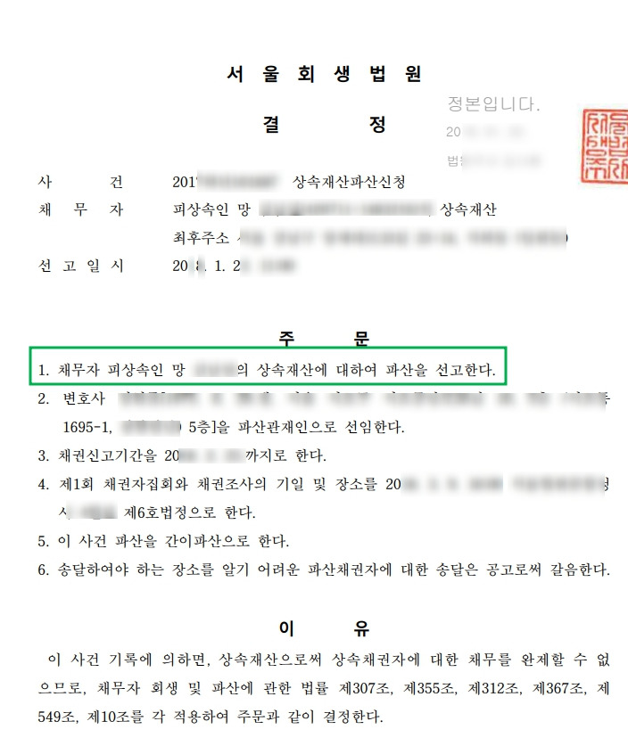 부모가 사망(상속개시)한 경우 1차 상속인은 자녀(직계비속-민법 제1000조)와 배우자(민법 제1003조)입니다. 상속인의 상속 포기 또는 제한 승낙 신청은 원칙적으로 부모가 사망한 날로부터 3개월 이내에 사망한 곳의 가정법원에 제기해야 합니다. (민법 제1019조) 이 기간이 경과한 때에는 사망한 부모(이하 ‘사망자’라 한다)의 적극적 재산(이하 ‘재산’이라 한다)과 수동적 재산(이하 ‘채무’라 한다)을 모두 합산한다. )은 상속인이 법적으로 소유하게 되며 단순히 비율에 따라 승인을 받고 포괄적으로 승계됩니다. 구체적으로, 1차 상속인이 모두 상속을 포기하는 경우 2차 상속인이 상속하게 되며, 해당 상속은 상속인의 형제자매 및 4촌 이내의 방계혈족에게 상속됩니다. 그러나 4촌 이내의 방계친척과 연락이 되지 않는 경우가 대부분이며, 이 경우 실무상 2차 상속인에게 상속을 방지하기 위해 1순위 상속인 중 한 명이 제한승인을 신청하게 됩니다. 간이승인, 상속포기, 한정승인 신청 판단기준https://mblogthumb-phinf.pstatic.net/MjAyMTA3MTNfMTQ5/MDAxNjI2MTQzMzY2ODcy.1LxgpTH0yFiqvGSI8DFpkXk2-JGMDuPgTbPTcw0uEnkg.igtD6Gc3C6pp4dehZc0mVRz4eHpkk5SquOJS4nVqWHMg. JPEG.tssangsok/%EC%A0%84%EB%AC%B8%EA%B0%95%EC%A1%B0A_ (%EB%93%B1%EB%A1%9D)_.jpg?type=w800