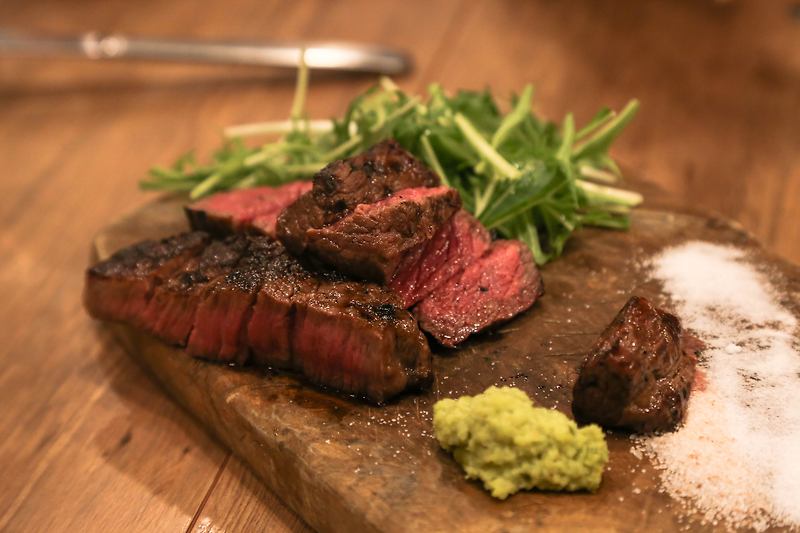 수상 경력을 자랑하는 스테이크하우스 일본에서는 고기가 야키니쿠로 귀결되지만, 조금 다른 것을 찾으려면 스테이크하우스에 가보세요. 후쿠오카 스테이크 대회에서 수상한 이력이 있으며, 거의 100% 일본인 현지 고객으로 붐비고 있습니다. 이키나리 같은 스테이크 전문점보다는 스테이크를 시그니처 메뉴로 하는 바에 더 가깝고, 스테이크 부위에 따라 다양한 요리와 술을 즐길 수 있다는 컨셉이다.