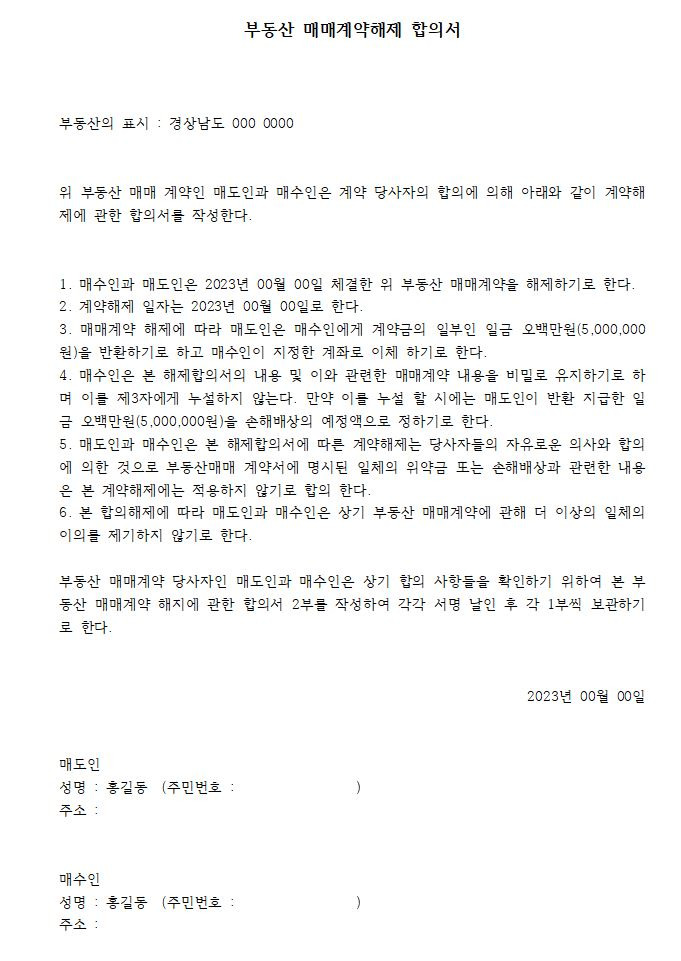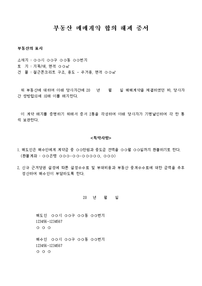 중도금을 이미 납부한 후에는 부동산 매매계약을 해지하기 어렵다고 앞서 말씀드린 바 있습니다. 그러나 항상 그렇듯이 예외적인 경우가 있습니다. 다음 4가지 경우에 계약을 해지할 수 있습니다. 계약을 해지할 수 있습니다. 당사자 간의 합의를 통해 계약이 종료되기 때문에 문제를 신속하게 해결할 수 있다는 장점이 있지만 그러한 합의가 결코 쉬운 일이 아님을 이미 알고 계실 것입니다. 예를 들어, 구매자가 계약을 체결하도록 유도하기 위해 판매자가 의도적으로 속이는 경우가 있습니다.3) 이는 판매자 또는 구매자가 약속을 이행하지 않는 경우에 가능합니다. 소유권이전등기 절차에 필요한 서류 4) 계약서에 말소를 위한 특약이 있는 경우 가능합니다. 계약시점에 이미 합의가 되어있기 때문에 문제없이 원만하게 해지 가능합니다.