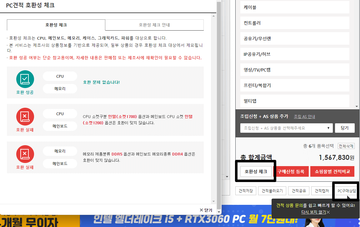 하지만 주 용도가 게임이나 힘든 작업이라면 외장 그래픽 카드와 쿨러를 추가하는 것이 좋습니다. 비용이 많이 증가한다는 단점이 있지만, 편안하게 조립된 컴퓨터의 기분 좋은 맛에 반할 수 있습니다. 3. 어떤 부품이 귀하에게 적합한지 알아보세요. “어떤 부분이 들어가는지는 알겠는데 어떤 부분이 내 목적에 맞는 걸까?”라고 생각하는 분들도 계실 텐데요. 지인이라면 차근차근 하나씩 알려드리겠지만, 블로그에서는 그렇게 할 수 없기 때문에 몇 가지 방법을 소개하겠습니다. 대형 사이트(컴퓨존, 다나와 등) 검색 가장 쉽게 알아보는 방법은 컴퓨존 등의 사이트에서 가격대별로 분류된 상품을 찾아보는 것이다. 조립식 컴퓨터이지만 완제품처럼 구성되어 있습니다. 원하는 가격대와 용도별로 분류되어 있어서 초보자들이 선택하기 좋은 제품입니다. 클릭해서 들어가시면 어떤 부품이 사용됐는지 알 수 있고, 부품별 가격도 공개되어 있어 직접 가격을 비교할 수 있습니다. 조립 서비스까지 제공하기 때문에 초보자도 조립 걱정 없이 데스크탑을 구입할 수 있습니다. 다만, 재고가 없는 오래된 CPU로 구성하는 경우도 있고, 견적을 내고 직접 조립해야 하는 경우도 있습니다. 단점은 가격이 더 비싸다는 것입니다. 가장 좋은 방법은 커뮤니티(Cool Enjoy, Quasar Zone 등)에서 견적을 받는 것입니다. 현재 컴퓨터를 조립하고 계시는 분들은 나중에 데스크탑을 구매하실 가능성이 높으니 조금만 공부하셔서 평생 PC를 조립할 수 있도록 노력해보시기 바랍니다. 모든 컴퓨터 관련 커뮤니티를 이용하실 수 있습니다. 저는 주로 쿨엔조이(Cool Enjoy)를 많이 언급합니다. 사이트에 접속하신 후 (조립/견적) 카테고리로 가시면 다양한 견적에 대한 질문이 나옵니다. 여기에서는 원하는 용도나 가격대를 검색하고, 최근 PC 조립에 어떤 부품이 사용됐는지 살펴볼 수 있습니다. 꽤 자세하게 물어보시는 분들이 많아서 조금만 검색해보시면 자신에게 맞는 가격대와 부품을 찾으실 수 있을 겁니다. 들어가시면 전문가나 제휴업체가 자세한 견적을 준비해서 보여드립니다. 괜찮다고 생각하시면 같은 구성으로 구매하셔도 되지만, 세부 부품을 바꾸거나 대리점을 바꾸는 등 견적은 자유롭게 내시면 됩니다. 4. 데스크탑 조립 호환성 확인 구매할 부품을 선택했다면 최종적으로 호환성을 확인해야 합니다. 가격을 맞추려고 열심히 노력했지만 호환성이 떨어져서 조립을 못했다면 큰 문제겠죠. 견적 사이트에 게시된 대부분의 견적은 호환 가능한 제품으로만 구성되어 있습니다. 부품을 마음대로 바꾸면 겁먹을 필요가 없습니다. 많은 사이트에서 호환성 확인 기능을 지원하는데, Shop Danawa를 통해 보여드리겠습니다. 오른쪽 PC의 주요 컴포넌트 중 각 컴포넌트를 선택하고 (삽입)을 클릭하면 원하는 컴포넌트를 추가할 수 있습니다. 원하는 부품을 모두 포함했으면 (호환성 확인) 버튼을 누르세요. 그런 다음 각 부품의 호환성을 확인하여 호환되는지 확인합니다. 모든 것이 제대로 호환되면 (성공)을 얻게 됩니다. 하나라도(고장) 있으면 부품이 호환되지 않는 것입니다. 버전이 일치하지 않거나 서로 간섭할 수 있습니다. 따라서 (실패한) 항목이 보이면 해당 부품을 교체해야 합니다. 모두 (Success)로 변경되면 호환성 문제는 없습니다. 그래도 시스템 오류일 수 있으므로 3단계에서 언급한 커뮤니티에 견적 질문을 올리고 이륙 허가(?)를 받는 것이 더 쉬울 것 같습니다. 부품은 별도로 구매도 가능하지만 저는 개인적으로 다나와나 컴퓨존 같은 대형사이트에 가는 걸 선호합니다. 에서 한꺼번에 구매하시길 추천드립니다. 조립서비스도 좋고 향후 A/S 문제도 간단하기 때문에 단지 최저가만을 목표로 하는 것이 아니라면 넓은 사이트를 이용하는 것이 좋습니다. 오늘은 조립식 컴퓨터에 필요한 부품과 나에게 맞는 부품을 찾아 견적을 내는 방법에 대해 알아봤습니다. 설명이 길었지만, 1~2시간 정도 천천히 살펴보면 누구나 자신의 필요에 맞는 컴퓨터를 쉽게 조립할 수 있습니다. 고가에 완제품을 구매하기보다는 비슷한 사양의 컴퓨터를 조립한 뒤 남은 돈으로 쇠고기를 구매하시기 바랍니다. 도움이 되었기를 바라며 여기서 마치겠습니다.