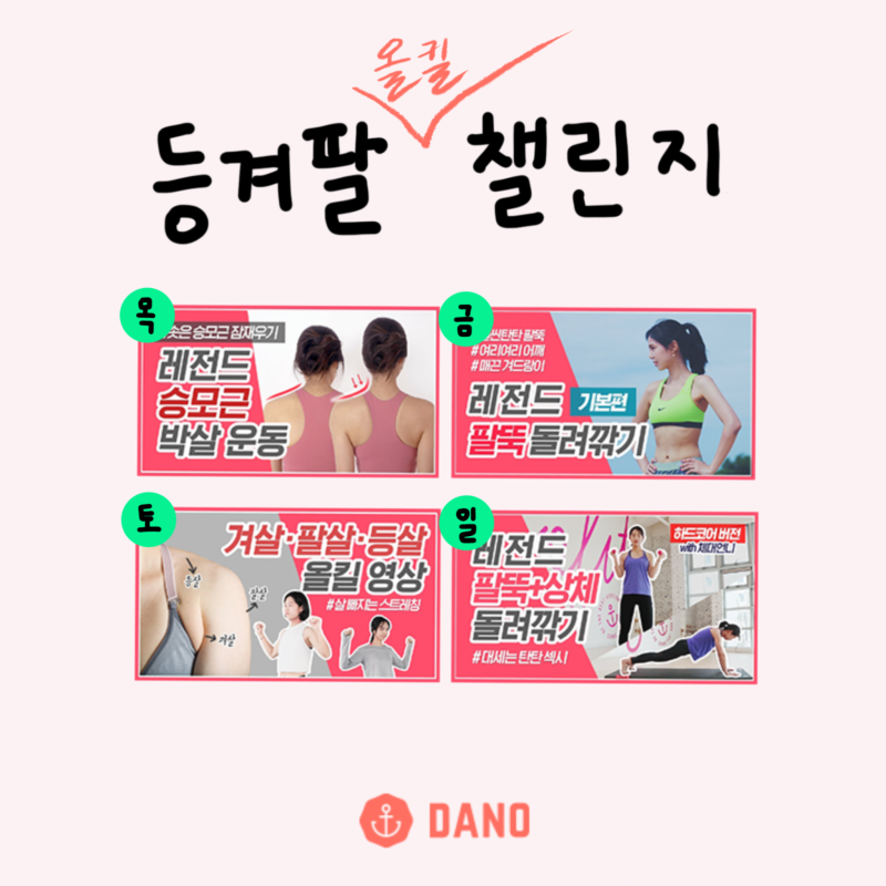 Inflatable Arms (Full Arms): 팔은 주유소 풍선 인형처럼 옆으로 몸부림치면서 허벅지를 밀면서 자연스럽게 호흡합니다. 그리고 아래로. 팔을 최대한 넓게 사용하는 것이 좋습니다. 팔 흔들기(저고리 고기): 2동작과 같이 작별인사를 하고 팔을 흔든다. 후퇴하다. 느린 손목 회전(팔 전체/어깨): 손목을 올리면서 천천히 회전 빠른 손목 회전(팔 전체/어깨): 양팔을 올리고 내리면서 손목을 빠르게 회전시킵니다. .낮음(팔뚝/등): 팔꿈치를 가차 없이 뒤로 당깁니다. 로보틱(어깨/쇄골/팔뚝): 응원 동작으로 팔꿈치를 고정한 상태에서 아래 팔을 위아래로 움직여 어깨 근육을 자극합니다. Front Cross (Full Arms): 팔을 앞으로 쭉 뻗고 손바닥을 앞으로 내밀고 손을 교차시킵니다. 로보틱(어깨/쇄골/팔뚝): 다시 로봇 동작으로 돌아가 팔꿈치를 고정하고 어깨를 위아래로 움직여 회전시킵니다. 전면 크로스(완전 팔): 전면 크로스로 돌아가서 손을 교차한 상태로 팔을 앞으로 뻗습니다. 로봇(어깨/쇄골/팔뚝): 마지막 로봇 동작 완료 우주선 배영(팔 뒤쪽): 상체를 약간 앞으로, 팔을 뒤로 뻗음 배영(팔 뒤쪽): 앉은 자세, 상체를 약간 앞으로, 마치 쥐듯이 계속 쥐기 팔 뒤쪽을 쥐었다가 뒤로 뻗는다. 어깨 회전(팔뚝/어깨): 한 번에 한쪽 어깨를 바깥쪽으로 느끼면서 회전합니다. 어깨 회전은 겨드랑이 지방을 제거하는 동시에 비뚤어진 어깨를 교정하는 데 매우 효과적입니다. 우주선 뒤로 밀기(팔 뒤쪽): 약간 앞으로 기울이고 팔을 뒤로 들어 올립니다. 킥백 펄스(팔 뒤쪽): 기대어 앉은 상태에서 상체를 약간 앞으로 들어 뒤로 뻗으면서 팔 뒤쪽을 맞물립니다. 어깨 회전(팔뚝/어깨): 좌우 어깨가 바깥쪽으로 향하는 것처럼 회전을 반복합니다.