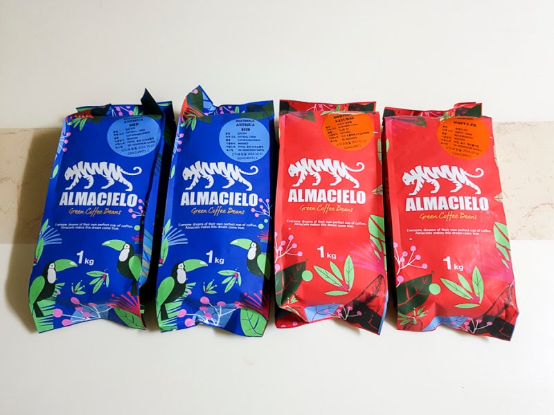 코로나로 2020년에 이어 2021년에도 홈카페로 친숙한 알마씨엘로의 첫 테이스팅 박스가 도착했습니다! 얼마전에 산 생두를 볶았더니 콩이 갑자기 풍성해졌네요~