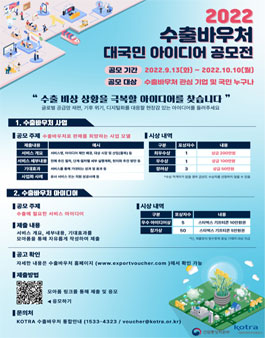 KOTRA가 개최하는 <2023 Export Voucher Public Idea Contest> 우리 중소기업의 수출에 도움이 되는 ‘수출 관련’ 서비스를 발굴합니다.