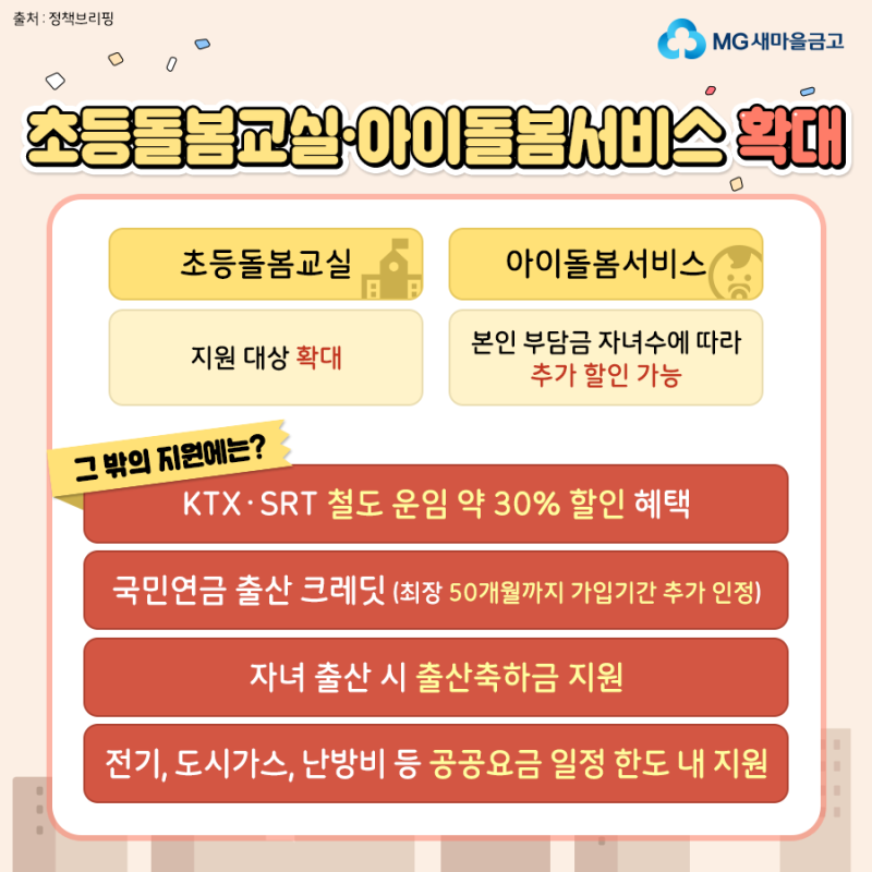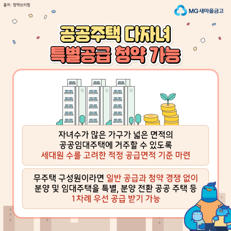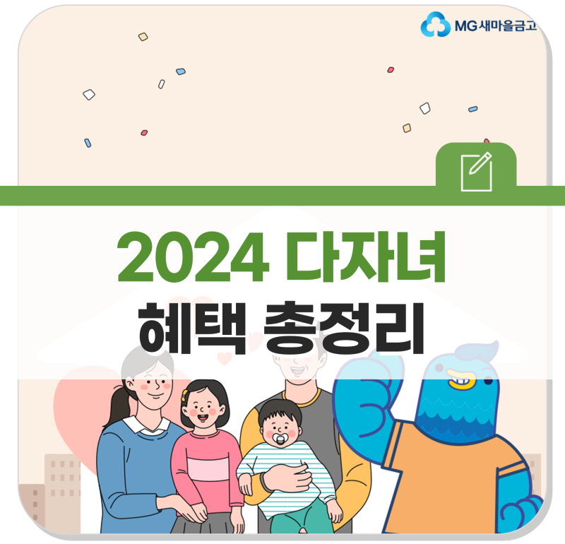 안녕하세요 MG새마을금고입니다. 이제 두 사람이라도 다자녀 혜택을 받을 수 있다는 사실, 알고 계시나요? 자녀 양육 부담을 실질적으로 줄이기 위해 다자녀 수당 기준을 3자녀에서 2자녀로 변경했습니다. 또한, 정부에서는 다자녀 가구를 지원하고 있습니다. 이를 위해 우리는 다양한 정책을 시행하고 이를 개선하기 위해 노력하고 있습니다. 오늘은 2024년 다자녀 혜택이 무엇인지, 어떻게 개선되었는지 자세히 살펴보도록 하겠습니다! 가족 중 해당되는 사항이 있으시면 잊지 말고 신청해주세요! 다자녀가 있는 공공주택에서는 특별공급을 신청할 수 있습니다! 다자녀가정의 경우 특별급여 신청이 가능합니다!