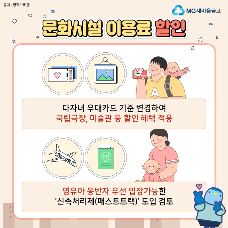 다자녀 우대카드 기준이 변경됨에 따라 국립극장, 박물관, 미술관 등 문화시설 이용요금 할인이 적용됩니다! 또한, 가족관계증명서 등도 증빙서류로 인정됩니다. 혼잡한 문화시설에는 영유아 우선 입장이 가능합니다. 패스트 트랙 제도 도입도 검토하겠다고 밝혔습니다. 초등학교 돌봄교실 및 보육서비스 확대! 보육서비스 확대는 물론, 출산지원금 등 다자녀 혜택까지 총망라!
